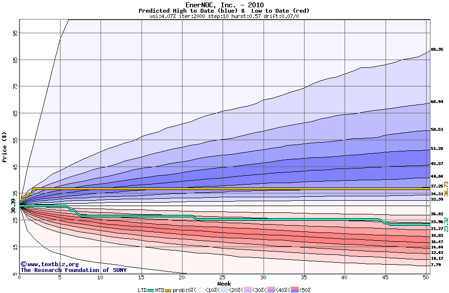 The following graph plots the year-to-date performance of the stock for 2010 compared to the probability calculated by a random walk model.