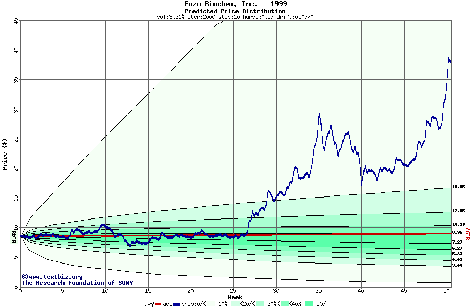 The following graph plots the year-to-date performance of the stock for 1999 compared to the probability calculated by a random walk model.