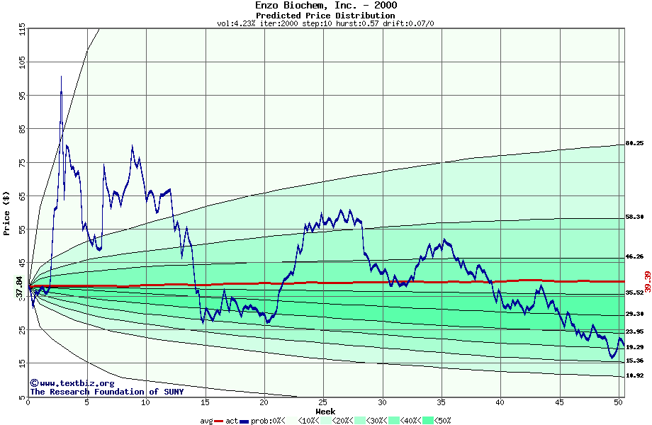 The following graph plots the year-to-date performance of the stock for 2000 compared to the probability calculated by a random walk model.