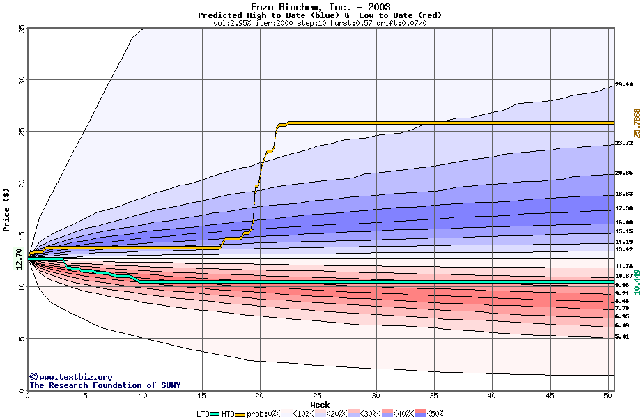 The high to date and low to date prices of the stock plotted against a random walk model for 2003 (what's this?).
