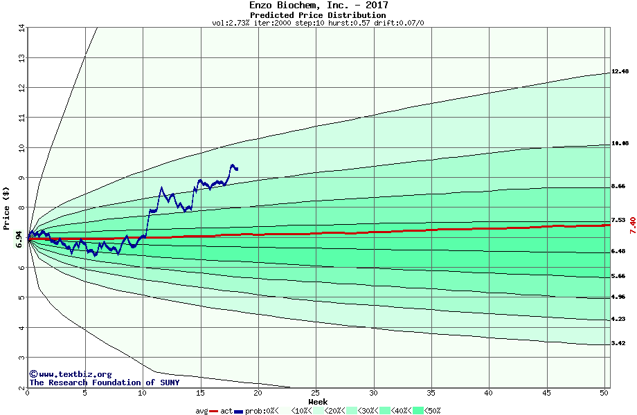 The following graph plots the year-to-date performance of the stock for 2017 compared to the probability calculated by a random walk model.