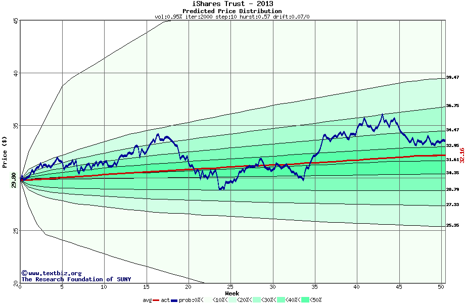 The following graph plots the year-to-date performance of the stock for 2013 compared to the probability calculated by a random walk model.