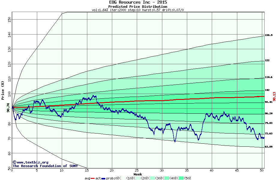 The following graph plots the year-to-date performance of the stock for 2015 compared to the probability calculated by a random walk model.