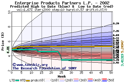 The high to date and low to date prices of the stock plotted against a random walk model for 2002 (what's this?).