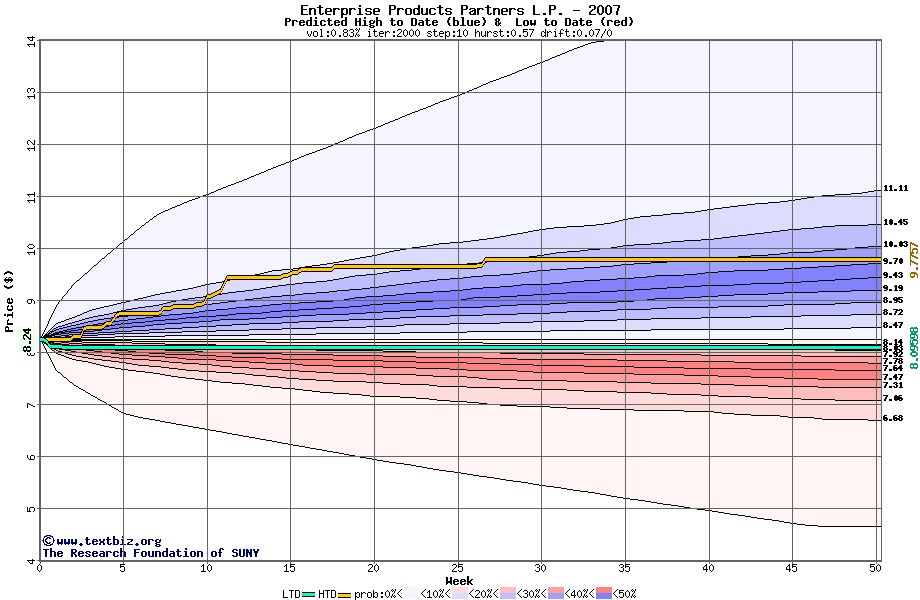The high to date and low to date prices of the stock plotted against a random walk model for 2007 (what's this?).