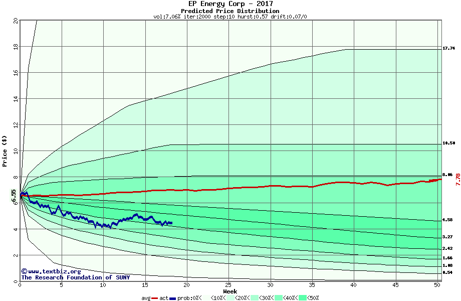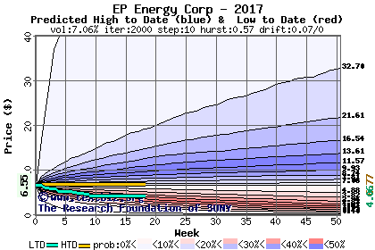 The high to date and low to date prices of the stock plotted against a random walk model for 2017 (what's this?).