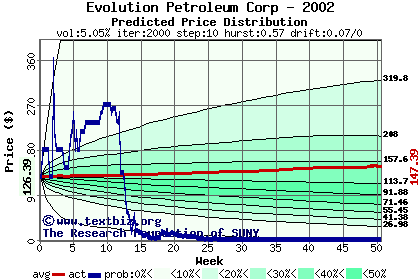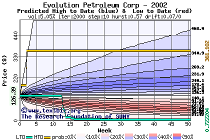 The high to date and low to date prices of the stock plotted against a random walk model for 2002 (what's this?).