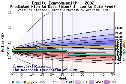 The high to date and low to date prices of the stock plotted against a random walk model for 2002 (what's this?).