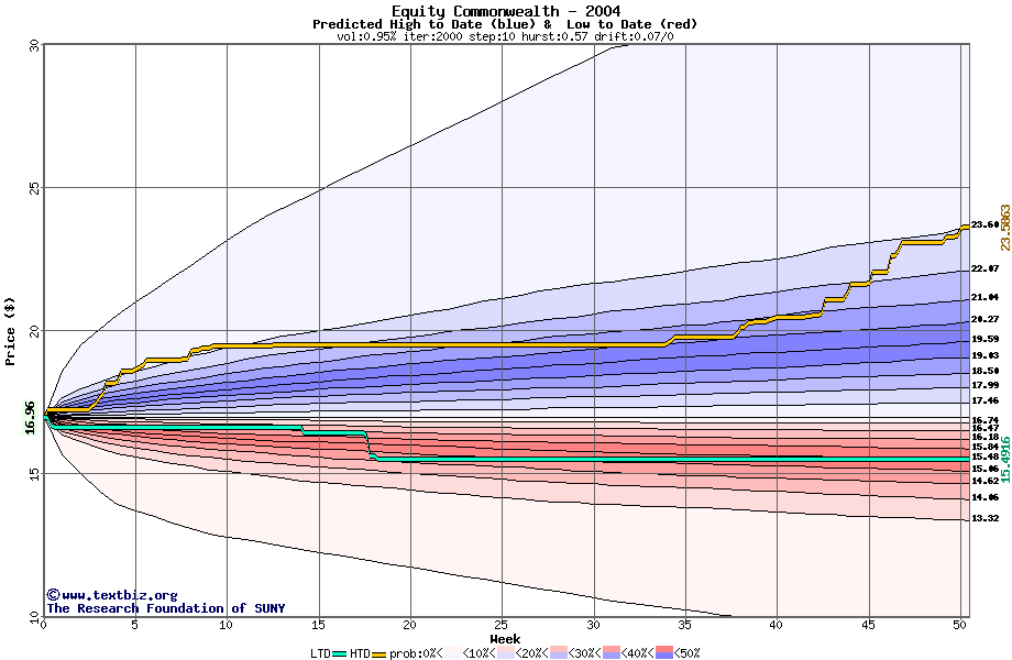 The high to date and low to date prices of the stock plotted against a random walk model for 2004 (what's this?).