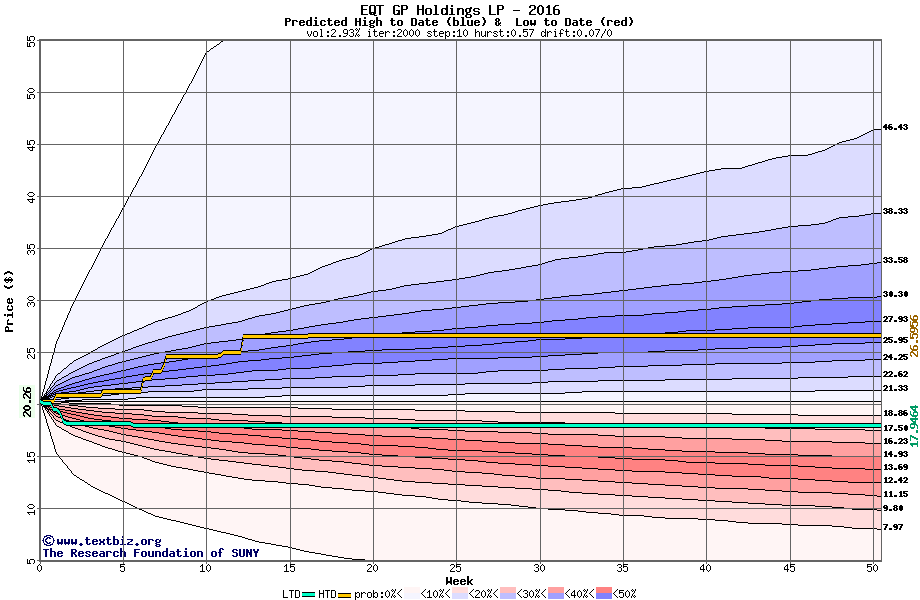 The high to date and low to date prices of the stock plotted against a random walk model for 2016 (what's this?).