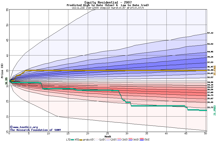 The high to date and low to date prices of the stock plotted against a random walk model for 2007 (what's this?).