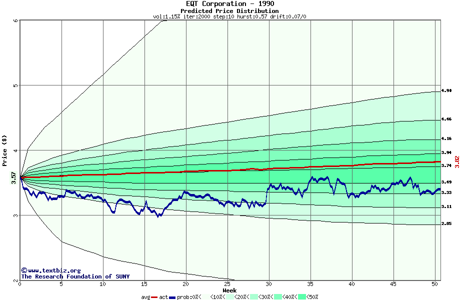 The following graph plots the year-to-date performance of the stock for 1990 compared to the probability calculated by a random walk model.