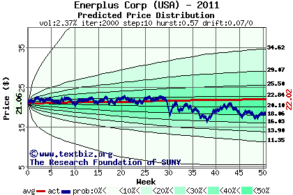 The high to date and low to date prices of the stock plotted against a random walk model for 2011 (what's this?).