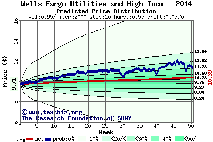 The high to date and low to date prices of the stock plotted against a random walk model for 2014 (what's this?).
