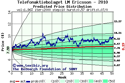 The high to date and low to date prices of the stock plotted against a random walk model for 2010 (what's this?).