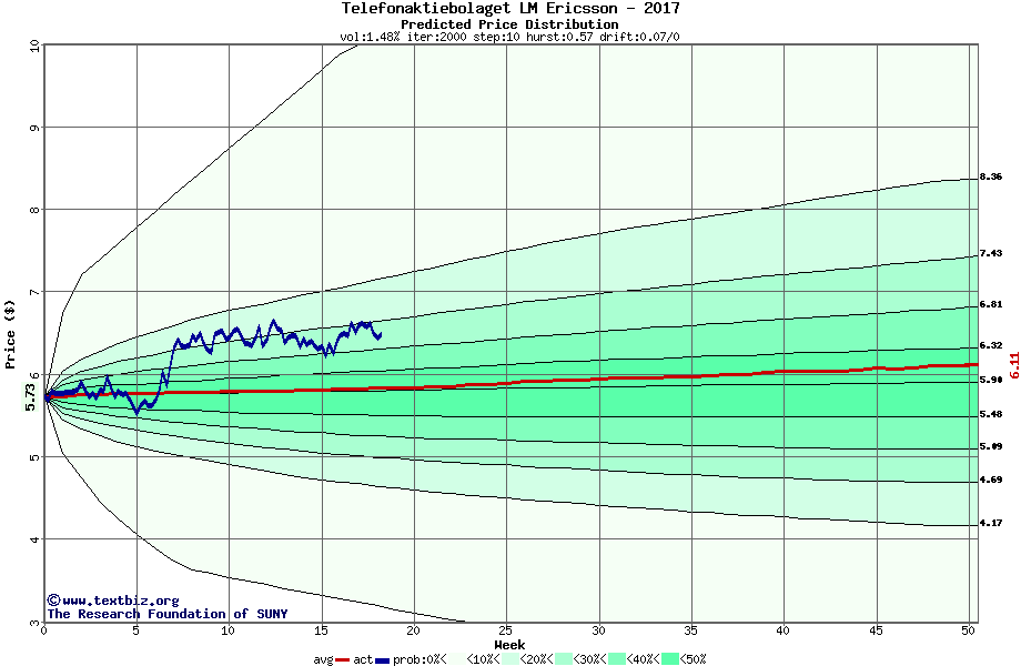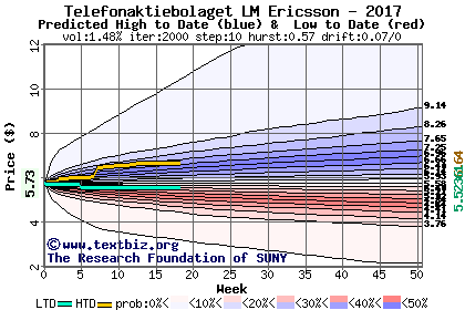 The high to date and low to date prices of the stock plotted against a random walk model for 2017 (what's this?).