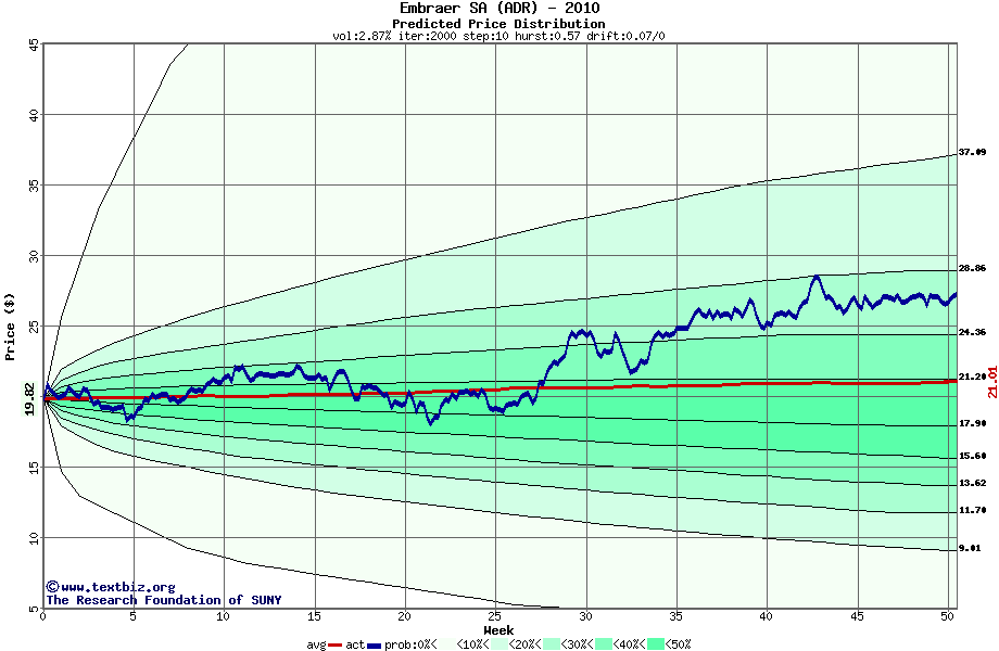 The following graph plots the year-to-date performance of the stock for 2010 compared to the probability calculated by a random walk model.