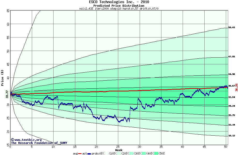 The following graph plots the year-to-date performance of the stock for 2010 compared to the probability calculated by a random walk model.