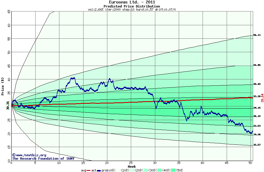 The high to date and low to date prices of the stock plotted against a random walk model for 2011 (what's this?).