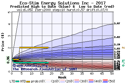 The high to date and low to date prices of the stock plotted against a random walk model for 2017 (what's this?).
