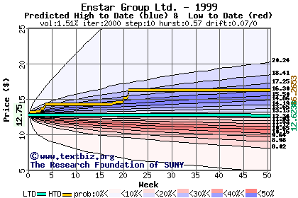 The high to date and low to date prices of the stock plotted against a random walk model for 1999 (what's this?).