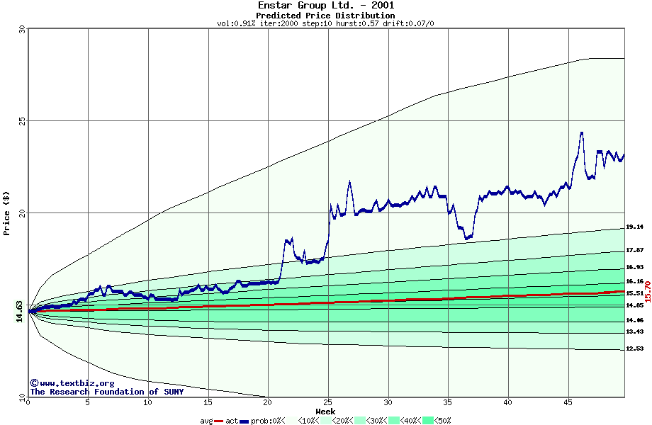 The following graph plots the year-to-date performance of the stock for 2001 compared to the probability calculated by a random walk model.