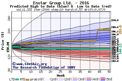 The high to date and low to date prices of the stock plotted against a random walk model for 2016 (what's this?).