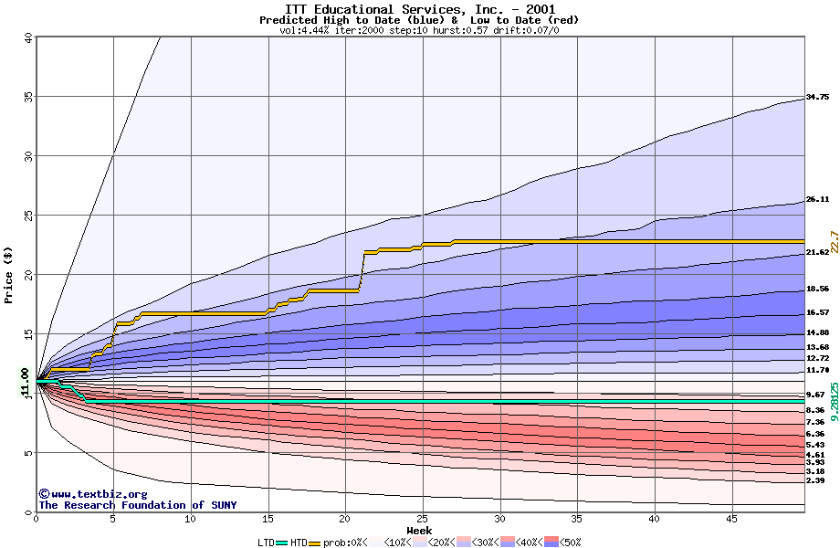 The high to date and low to date prices of the stock plotted against a random walk model for 2001 (what's this?).