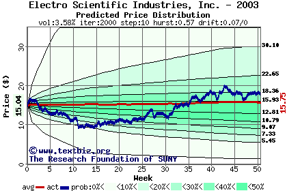 The following graph plots the year-to-date performance of the stock for 2003 compared to the probability calculated by a random walk model.