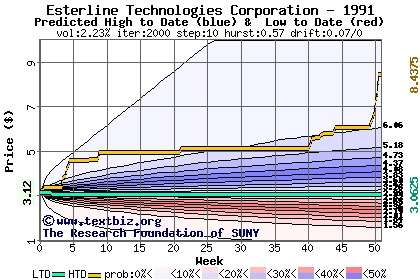 The high to date and low to date prices of the stock plotted against a random walk model for 1991 (what's this?).