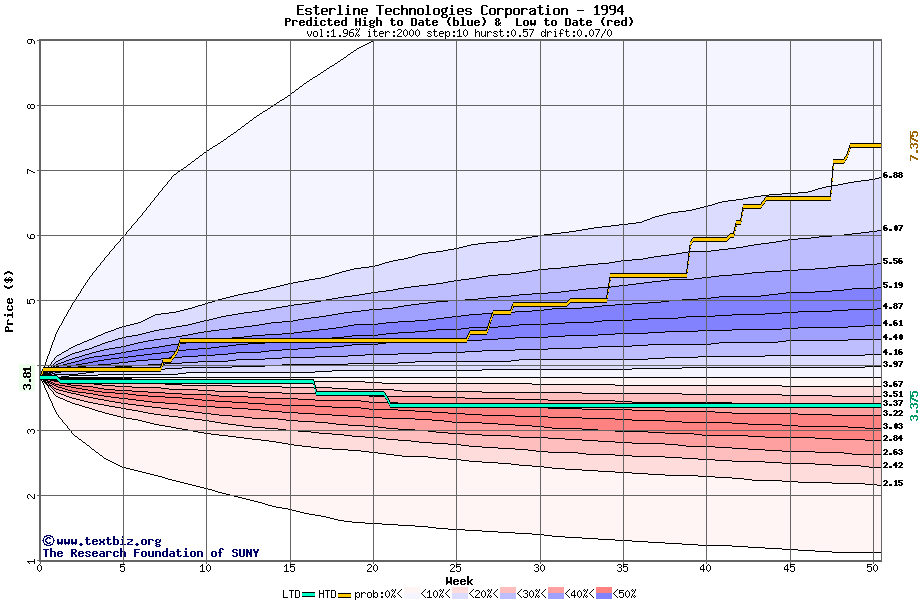 The high to date and low to date prices of the stock plotted against a random walk model for 1994 (what's this?).