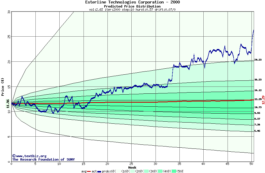 The following graph plots the year-to-date performance of the stock for 2000 compared to the probability calculated by a random walk model.
