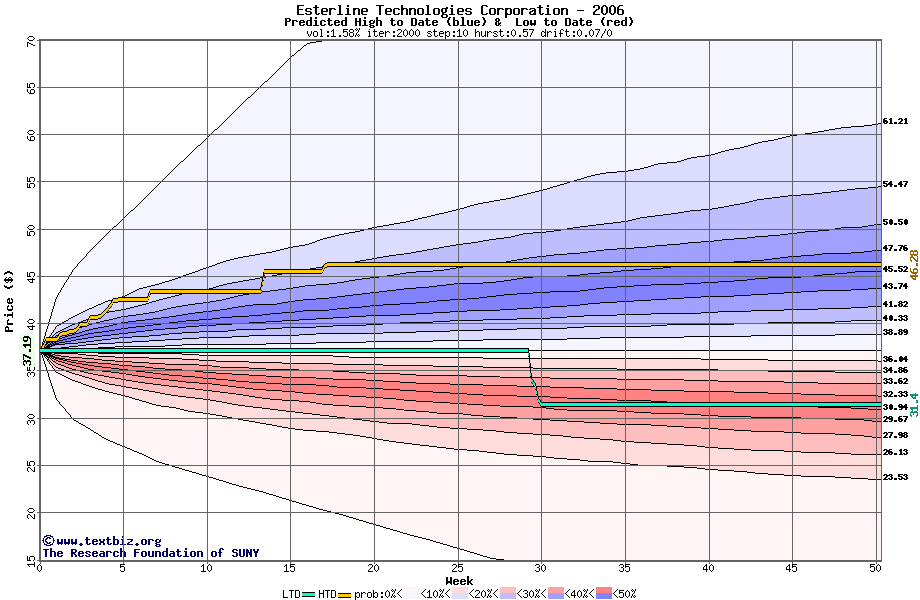 The high to date and low to date prices of the stock plotted against a random walk model for 2006 (what's this?).