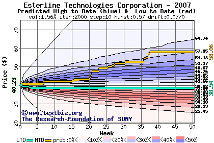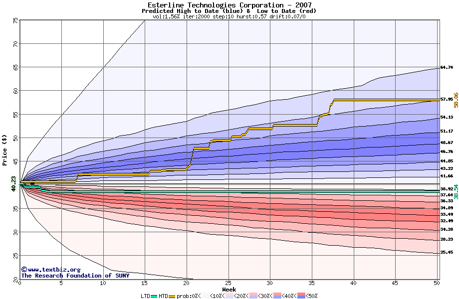 The high to date and low to date prices of the stock plotted against a random walk model for 2007 (what's this?).