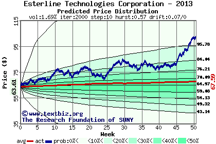 The high to date and low to date prices of the stock plotted against a random walk model for 2013 (what's this?).