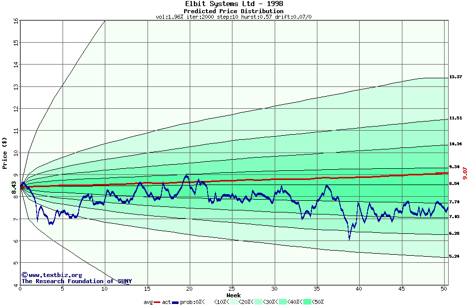 The following graph plots the year-to-date performance of the stock for 1998 compared to the probability calculated by a random walk model.