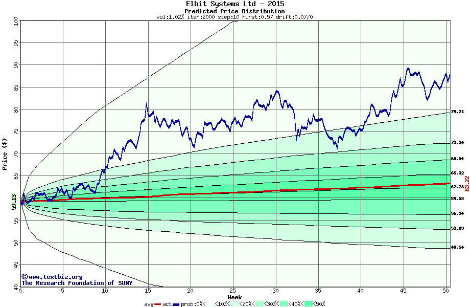 The following graph plots the year-to-date performance of the stock for 2015 compared to the probability calculated by a random walk model.