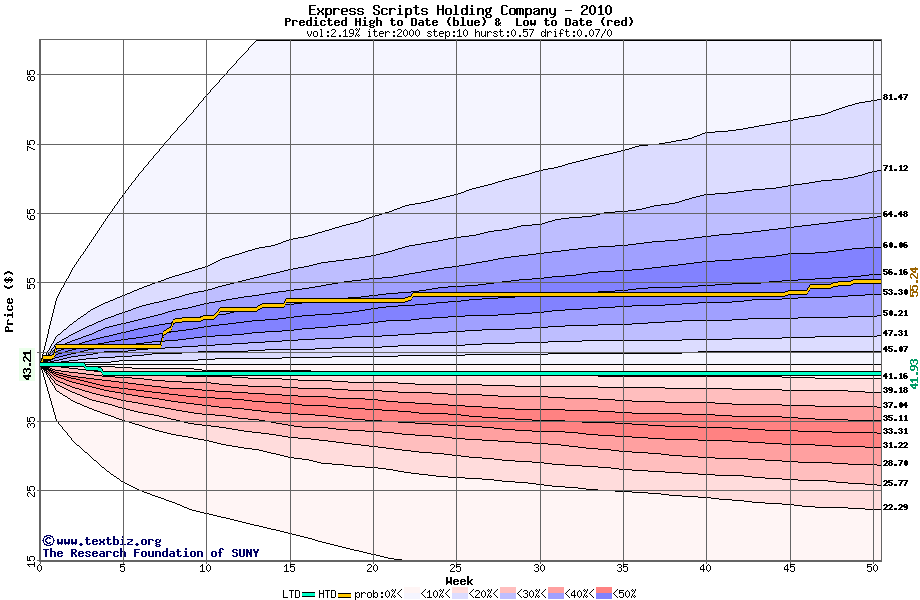 The high to date and low to date prices of the stock plotted against a random walk model for 2010 (what's this?).
