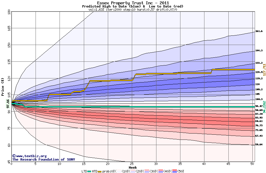 The high to date and low to date prices of the stock plotted against a random walk model for 2011 (what's this?).