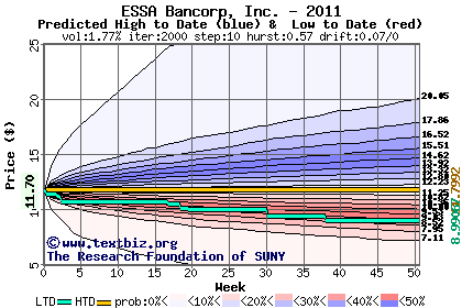 The high to date and low to date prices of the stock plotted against a random walk model for 2011 (what's this?).
