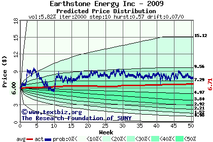 The high to date and low to date prices of the stock plotted against a random walk model for 2009 (what's this?).