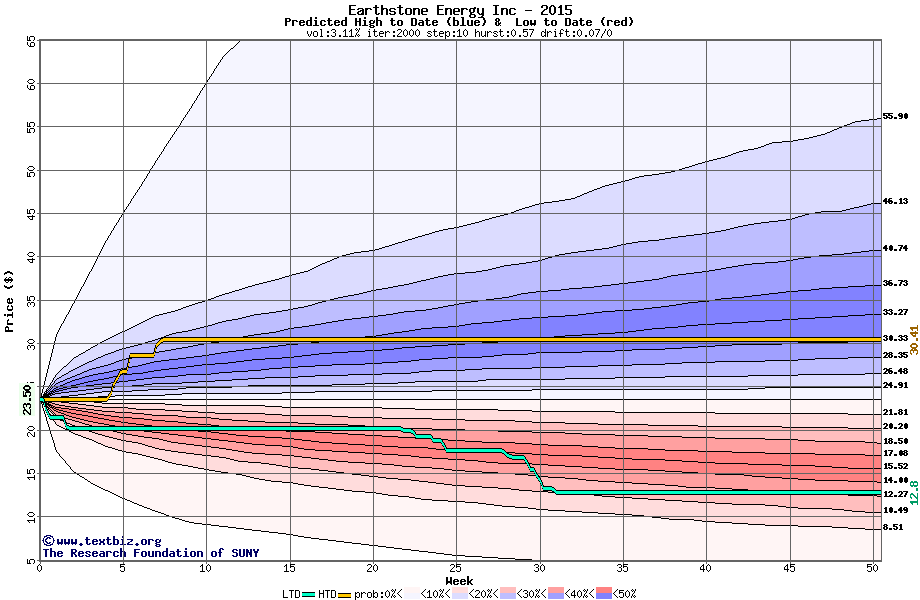 The high to date and low to date prices of the stock plotted against a random walk model for 2015 (what's this?).
