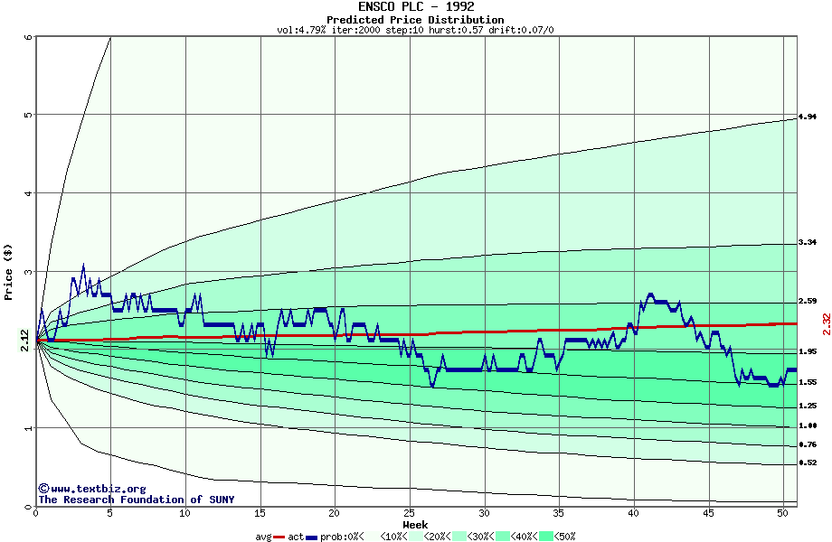 The following graph plots the year-to-date performance of the stock for 1992 compared to the probability calculated by a random walk model.