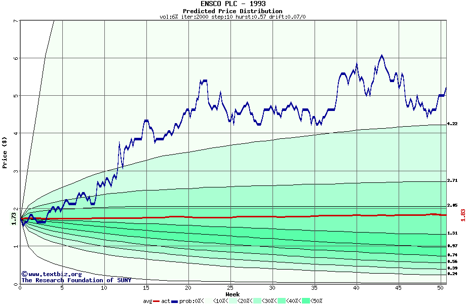 The following graph plots the year-to-date performance of the stock for 1993 compared to the probability calculated by a random walk model.