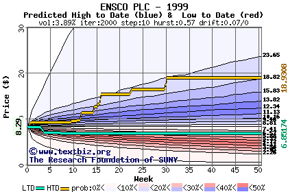 The high to date and low to date prices of the stock plotted against a random walk model for 1999 (what's this?).