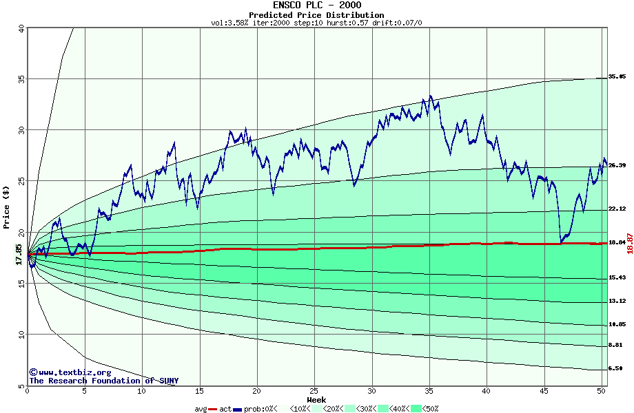 The following graph plots the year-to-date performance of the stock for 2000 compared to the probability calculated by a random walk model.