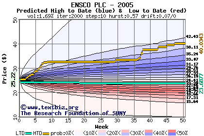 The high to date and low to date prices of the stock plotted against a random walk model for 2005 (what's this?).