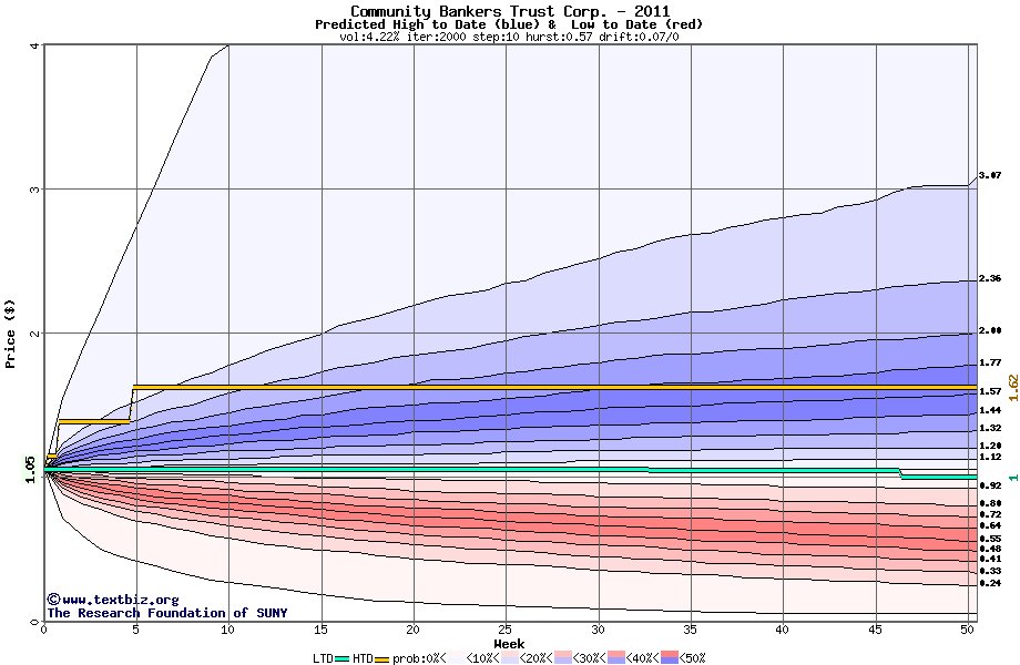 The high to date and low to date prices of the stock plotted against a random walk model for 2011 (what's this?).