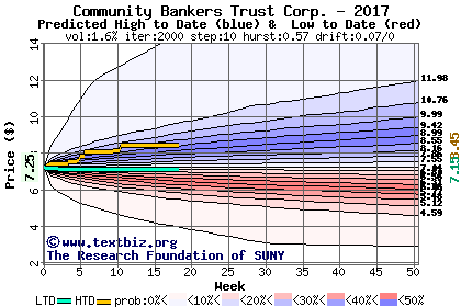 The high to date and low to date prices of the stock plotted against a random walk model for 2017 (what's this?).