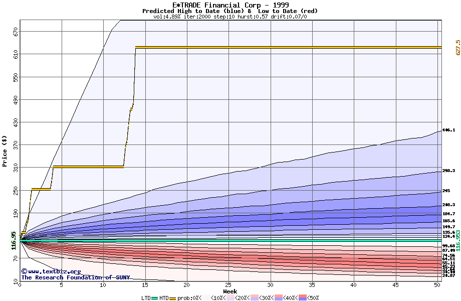 The high to date and low to date prices of the stock plotted against a random walk model for 1999 (what's this?).